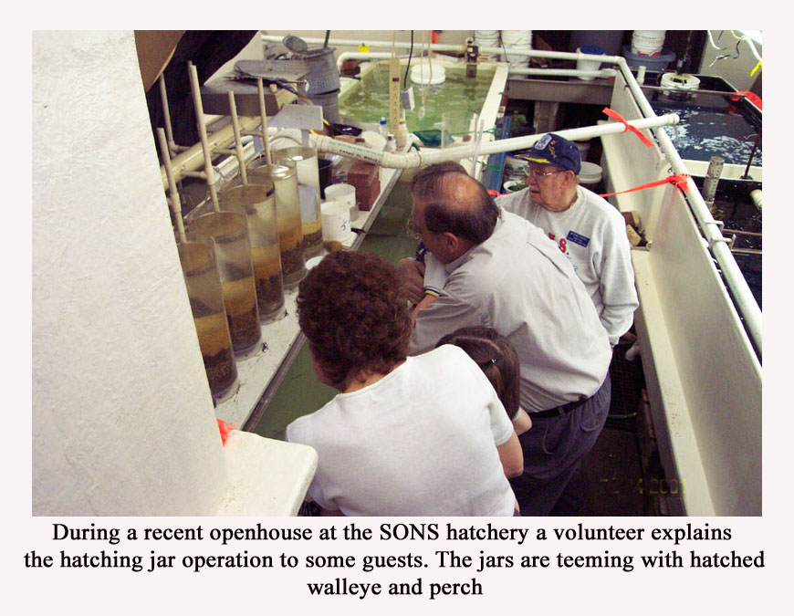 S.O.N.S Fish Hatchery The SONS joined the Cooperative Nursery program sponsored by the PFBC and initially established a hatching facility in a 50' trailer on the Water Department property at the foot of Chestnut. This facility was affectionately called Walleye on Wheels by the SONS members. 700,000 walleye eggs were obtained from the PFBC Linesville, PA facility and were successfully hatched and stocked in Presque Isle Bay. The following year a new hatchery building was constructed on the northwest corner of the Water Dept. Property. Since1985 the SONS hatchery has produced millions of walleye, perch, brown trout and steelhead hatchlings. |